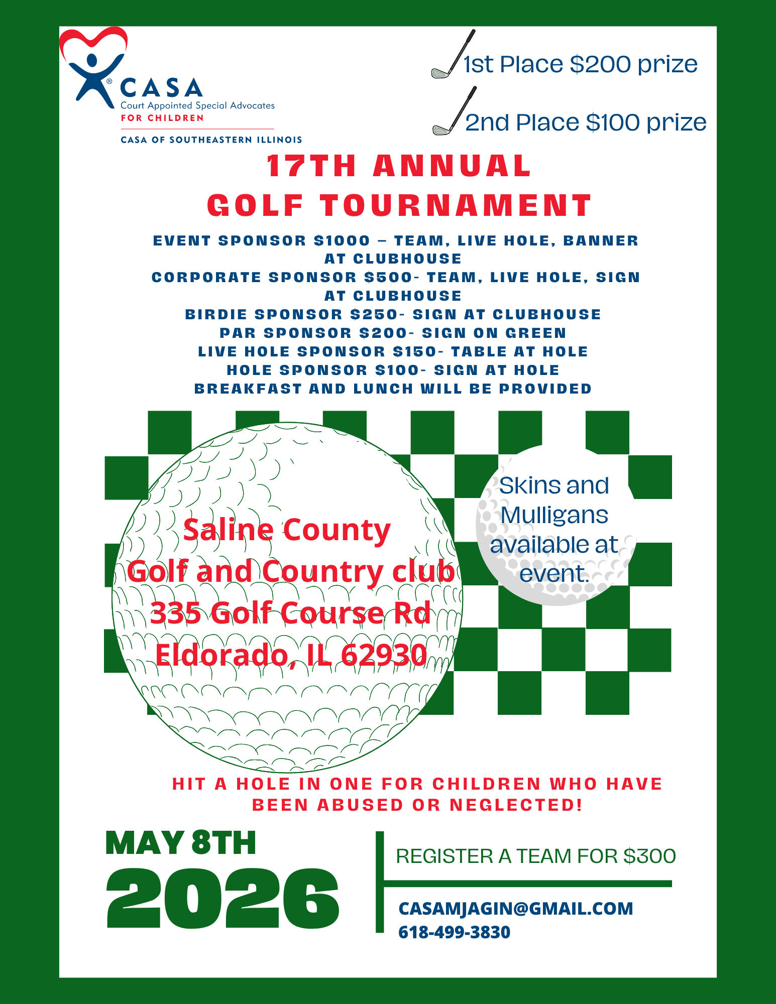 As you may well be aware, each year hundreds of children are abused and neglected. This is why we are teaming up together to help raise funds for CASA of Southeastern Illinois (previouslyCASA of Saline County). It is very important to be able to provide each child who has been abused or neglected with a voice in our judicial system. We ask that you support the ongoing efforts to make sure each child’s voice is heard. We are hosting the Seventeenth annual golf tournament to be held on May 8,2026 at the Saline County Country and Golf Club benefitting CASA of Southeastern Illinois. We look forward to seeing you there and thank you in advance for your support.